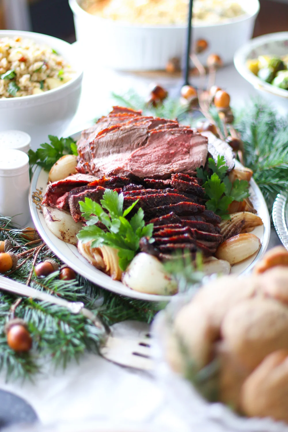 4. Put the roast in a 300°F oven for 3 hours (reaching 145°F internal for medium doneness). Let the roast rest for at least 10 minutes, then slice thinly to serve.