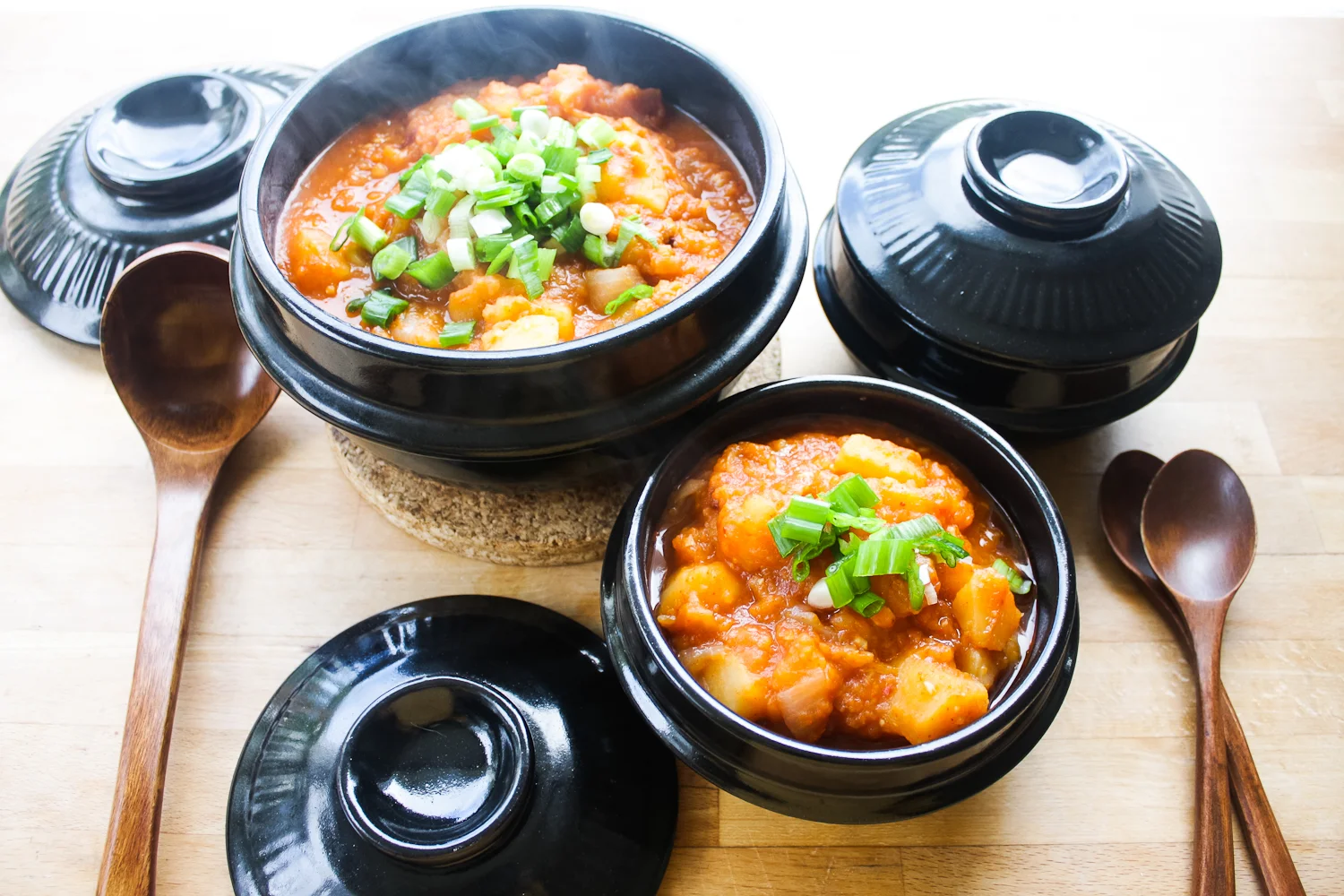 3. While the stew is boiling, cut the green onions into small pieces and set aside. Bring down the stew to a medium heat and stir to prevent any burning. Continue to occasionally stir and keep at a low boil until potatoes are really tender, about 20 more minutes. Let the stew slightly cool down, top with green onions, and drizzle with sesame oil.