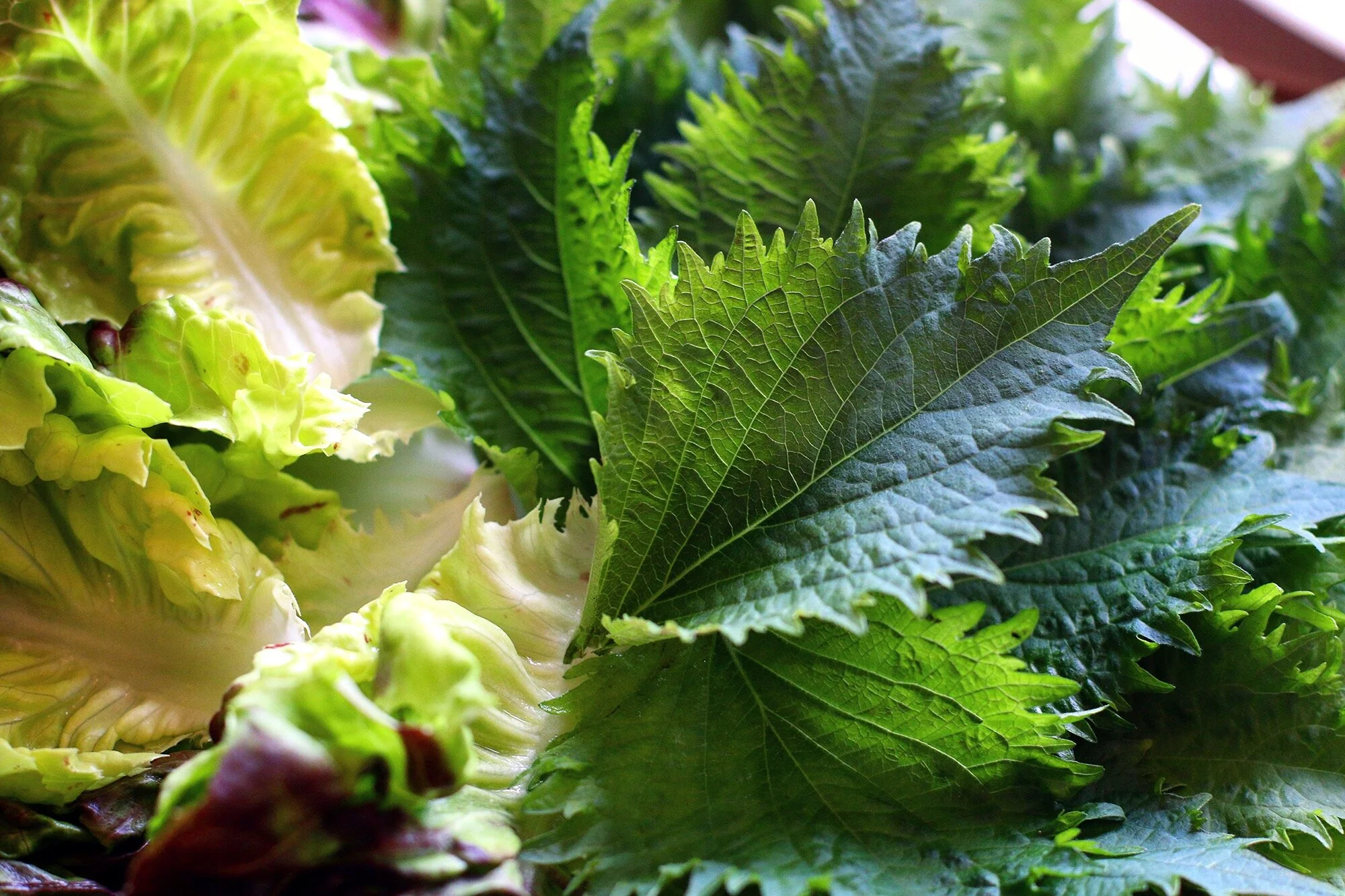 Red leaf lettuce is the most common wrap for ssam, but you can have a variety of greens. Kkaennip (perilla leaves) gives a slight black licorice and mint flavor that really punches up the bundle. Thinly sliced mu (Korean radishes) marinated in vinegar and sugar also play nicely together. The main note you're looking for in the wrap is something that is refreshing and can hold the package of umami you're gently trying to cram into your face.