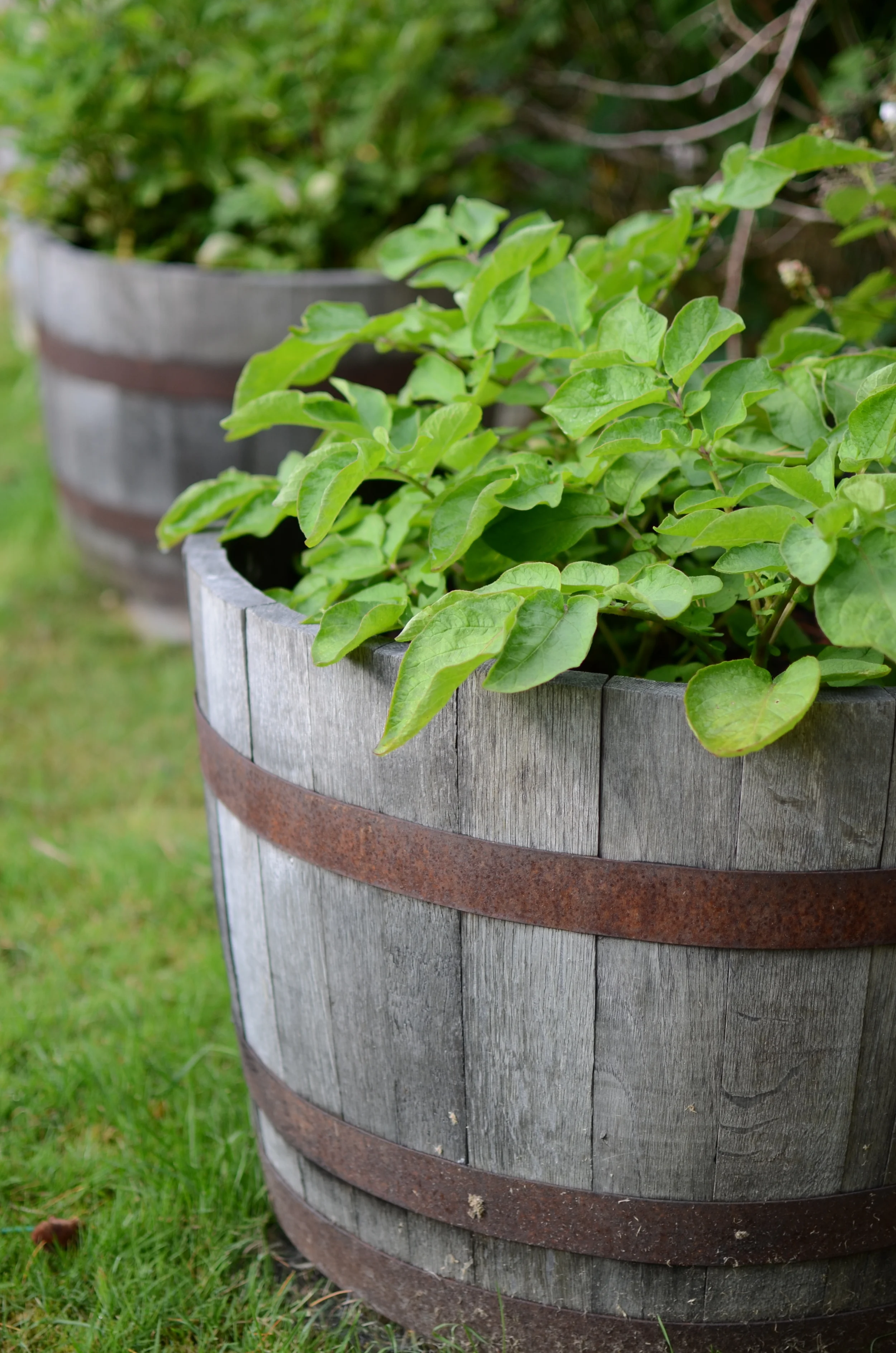 Potatoes in a wine barrel - photo by Seattle Urban Farm Company